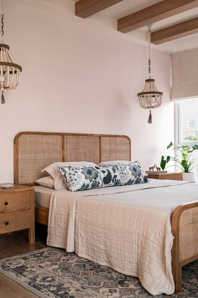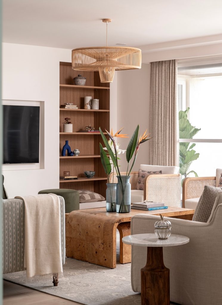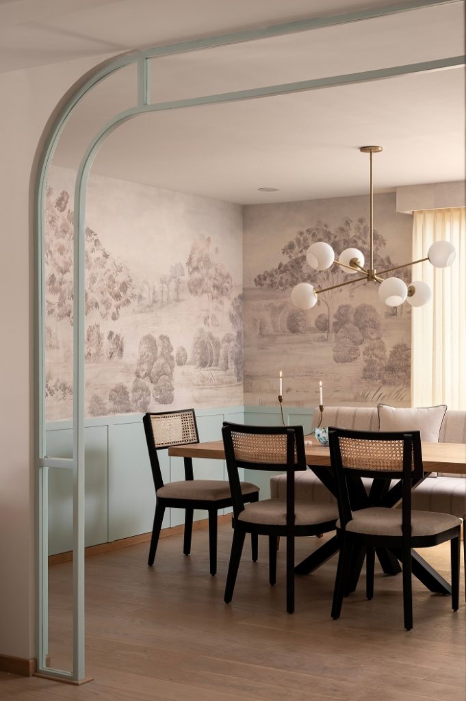 This play of bold imagery contrasted by a homogeneously hued shell continues in the nursery, where a vivid jungle scape flickers to life. The bedrooms take a page from the luxe yet grounded resting spaces the clients have inhabited during their global escapades, creating sanctuaries of repose.