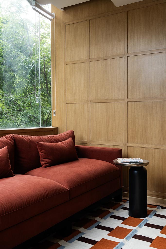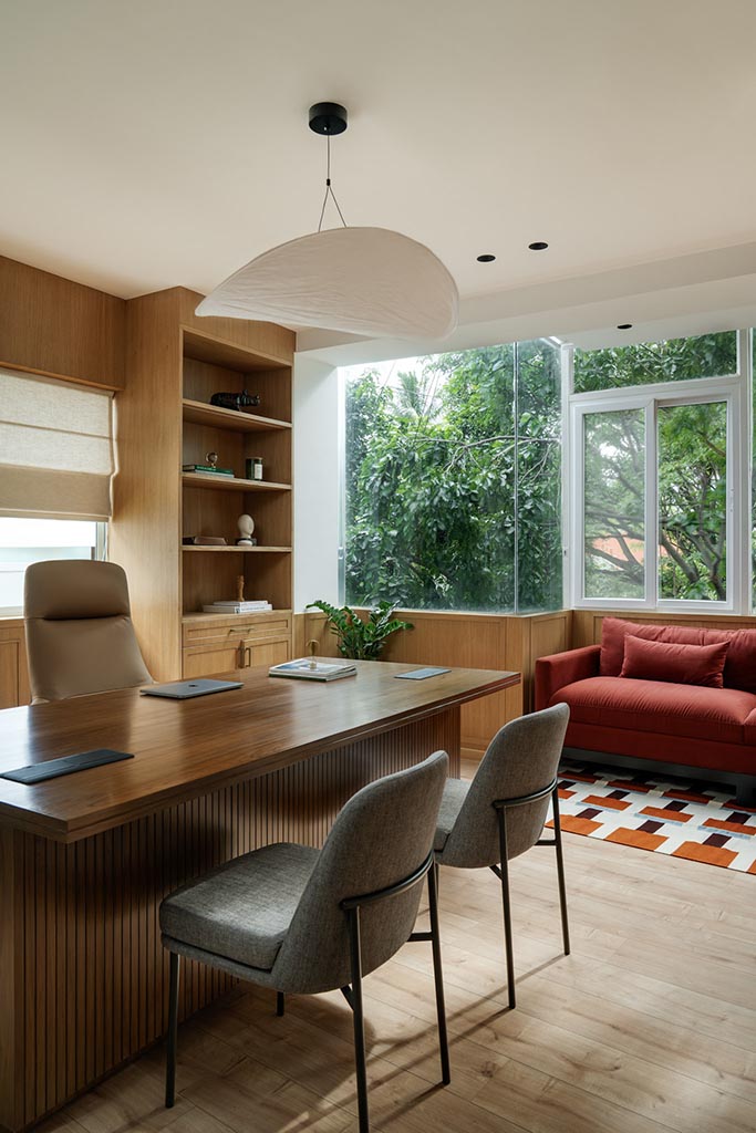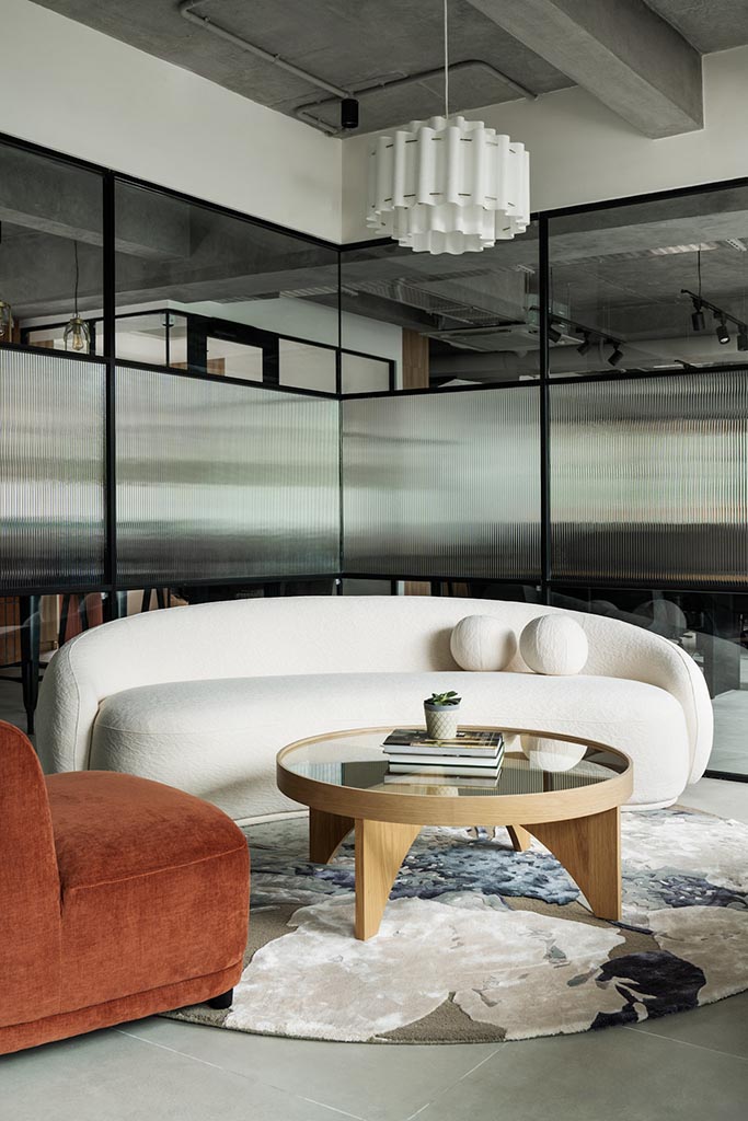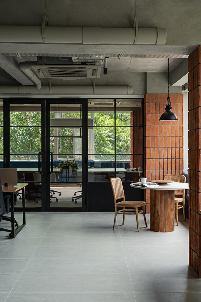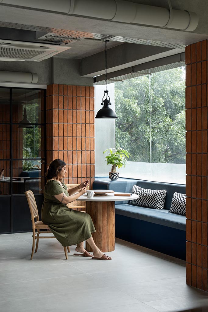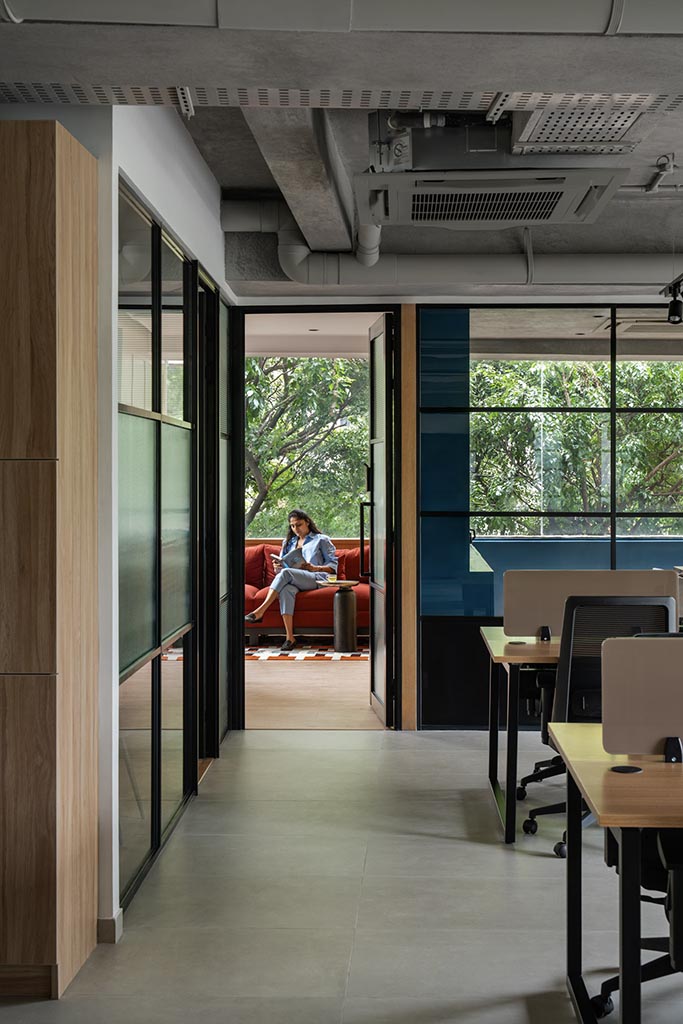 The office has a clever layout which is not just functional but also creatively tucks in the asymmetry we had into the cabins leaving the larger open communal office space feeling clean and sharp, the real design focus comes in how there are visual pockets that create a lived in warm feel much like a home. From a tone on tone window seat inspired nook for informal meetings to a deep blue and concrete hued conference room that invokes a moody vibe or the directors cabin drenched in warm wood and a bold red, the office is punctuated with interesting and defining moments throughout.