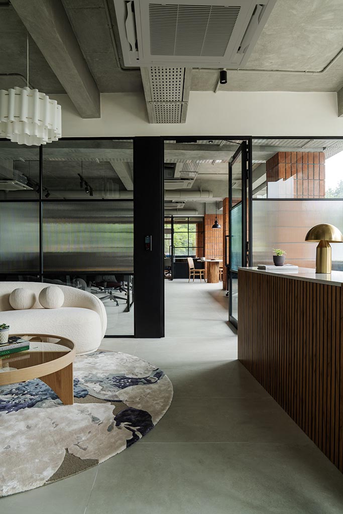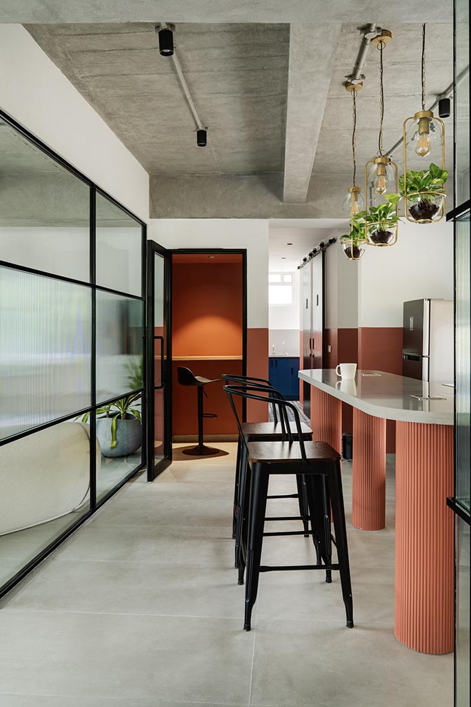This 2500 sq ft space is reimagined as a modern industrial loft inspired office and designed with some of the classic elements like red brick, concrete and blacks albeit with a fresh modern lived in feel that’s signature to weespaces.The brutalist structure with large structural beams and columns is layered with the warmth of wood, deep rich blues and corals and lots of greenery.