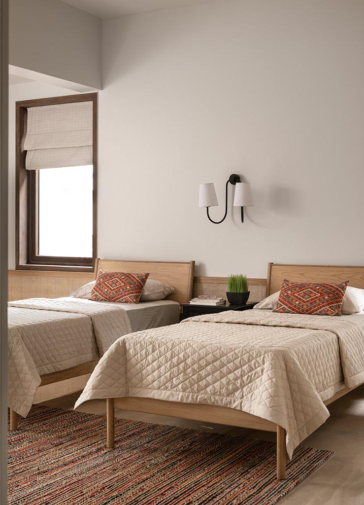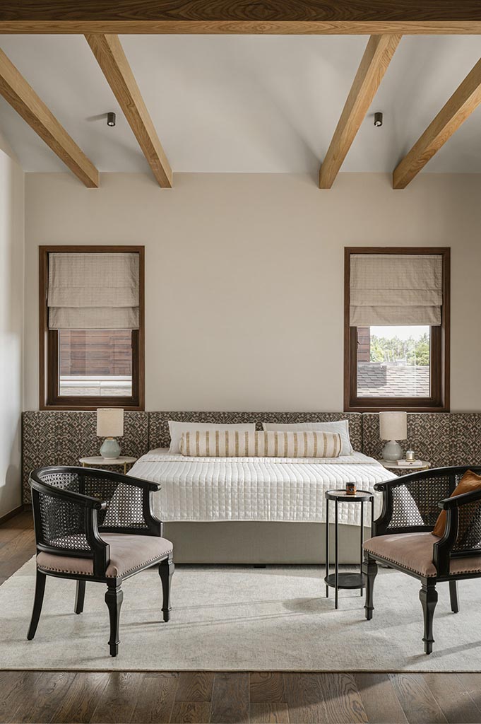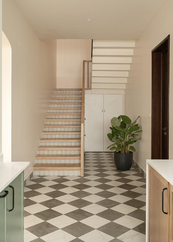 The informal living room hosts a swing, a nod to Indian homes and American porches, reflecting the home’s overall spirit which is light, contemporary and immaculate. Details across the space like soft arches, brick flooring and a patterned tile lining the staircase embrace the relaxed vibe of a hacienda that occupies the space without overwhelming the design.