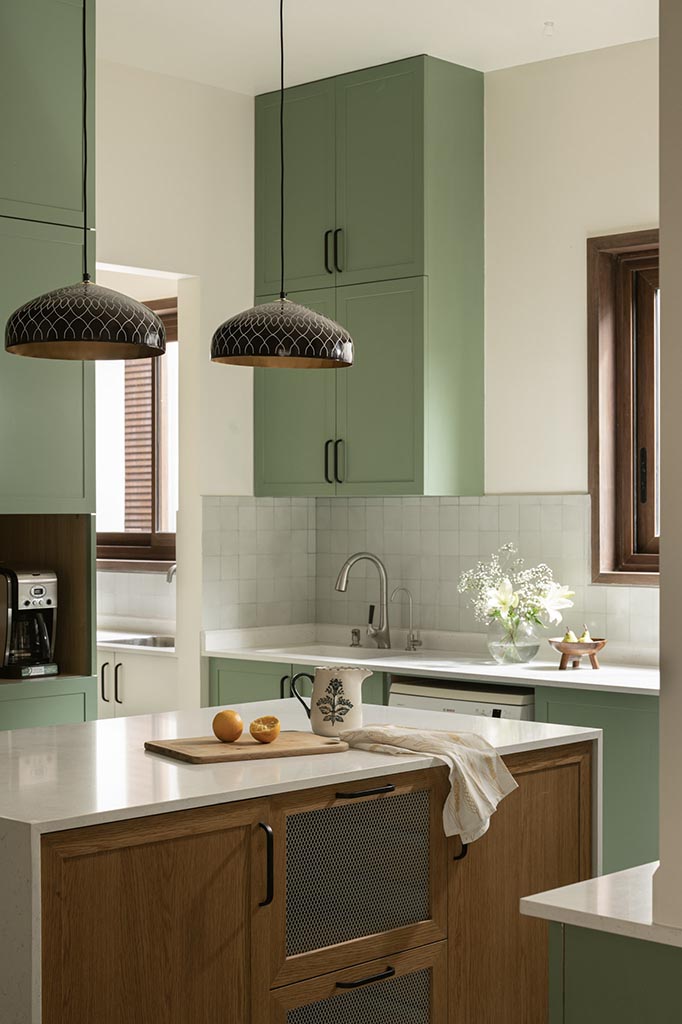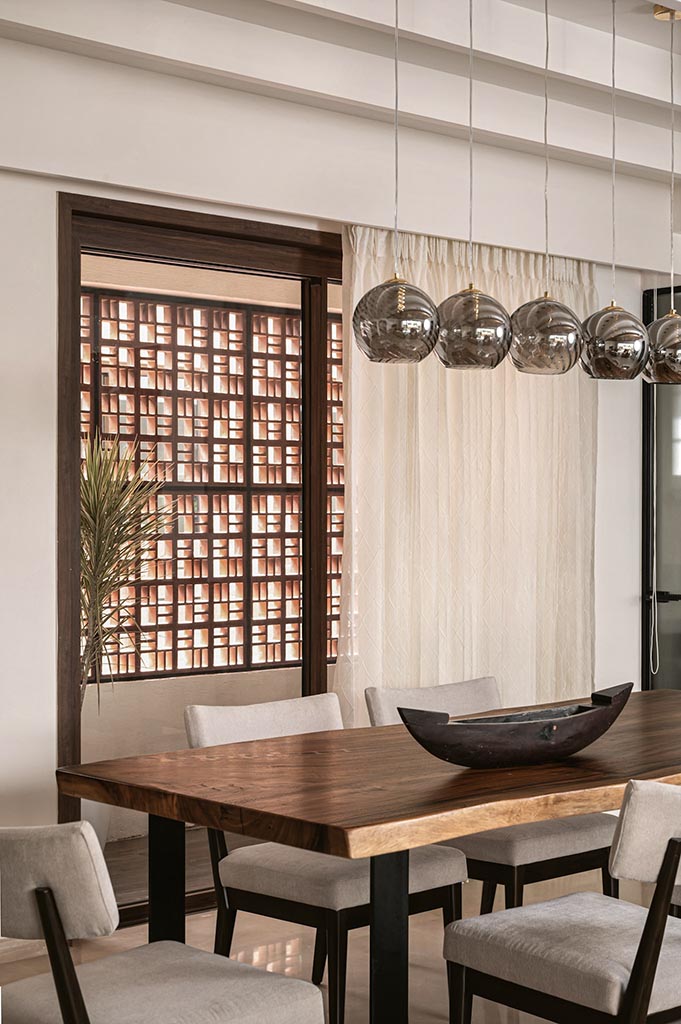 Wood used in the ceiling, furniture, flooring provides a sense of warmth and continuity in the home. Black metal accents bring out a contrast, pairing with the stone surfaces. These earthy tones and natural materials receive their bold intervention in the form of printed, handmade tiles, grass accents and bricks that detail the home, but don’t overpower it.