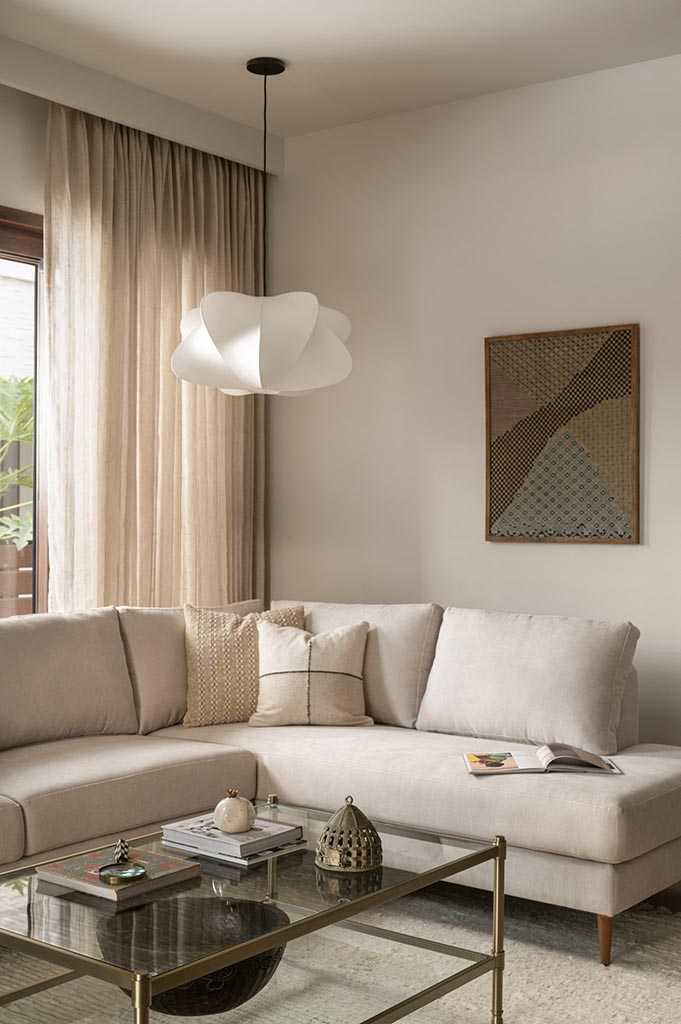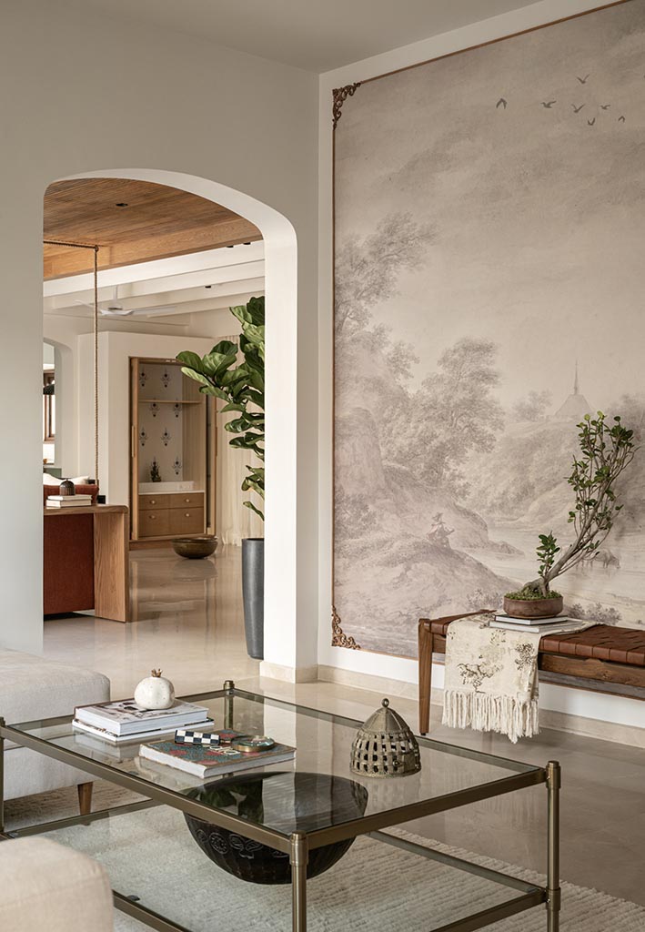 The home balances two distinct sensibilities, the earthy rootedness of Indian design and the casual, breezy spirit of a Californian aesthetic. This idea is seen through the placement of contemporary objects alongside traditional pieces, and the use of art that narrates cultural stories.