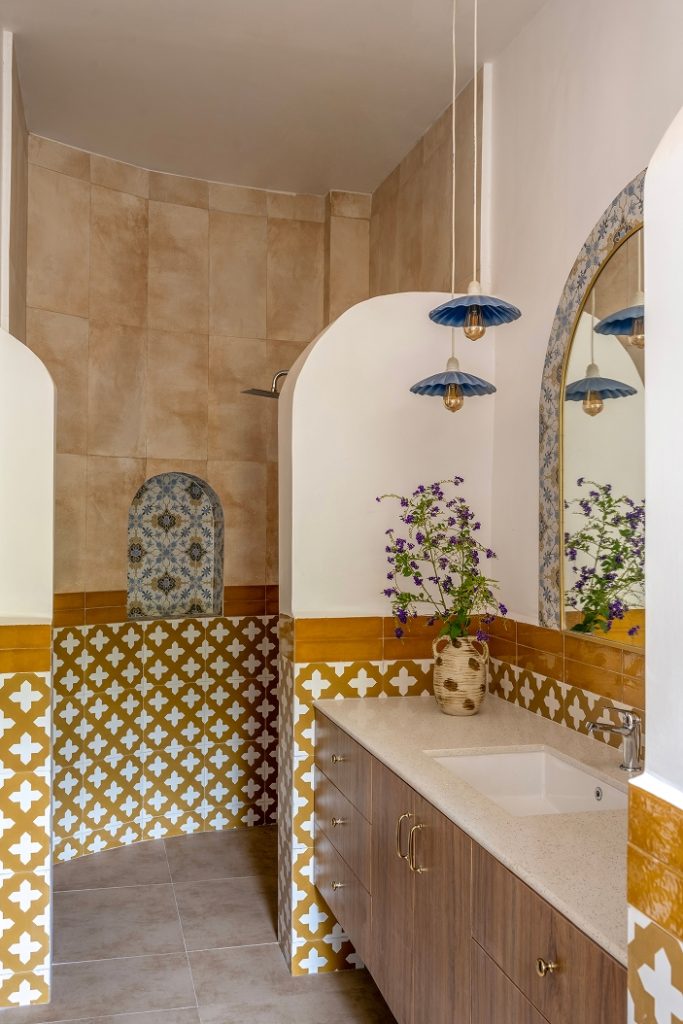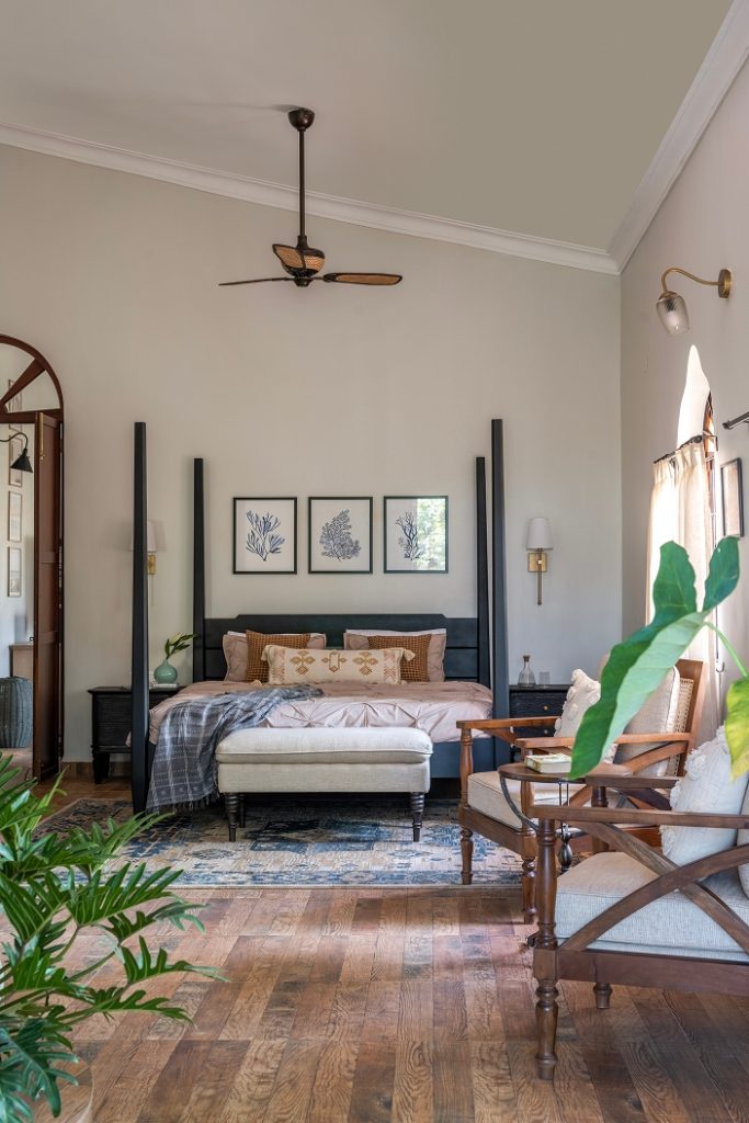 The doors open into a large living area exhibiting a reworked layout. Here, indigo, ochre, and umber tones coalesce seamlessly, painting an image of the sea and sand — a love letter to the land of Goa. The elevated lounge overlooks the verdant landscape through the archetypal, Portuguese-style windows. While the dining area is straight out of a vintage Goan painting, its interplay of wood, cane, and metal evokes a milieu from an era bygone. Within the pitched roof’s soaring volumes, the bedrooms embody repose, their curation intentional and playful in its ode to Goa.