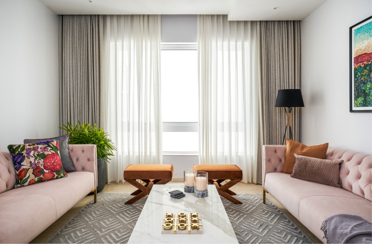 The formal living space comprises blush velvet sofas informing the bijou room’s layout, alongside a marble coffee table and ochre ottomans. A 12-foot custom sofa, olive chairs, and a tufted leather ottoman formulate the informal living area’s blueprint. Lime-washed white brick walls, an array of wood beams, and a black chandelier add textural depth while the balcony ushers in light. Held within the membrane of a glass-metal partition system, the monochrome landscape mural, bar cabinet, and round marble table whip up an intimate milieu in the dining room.