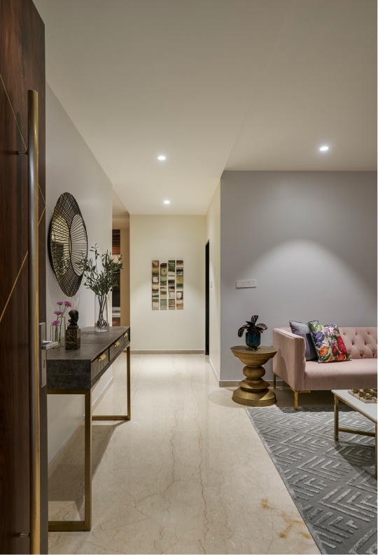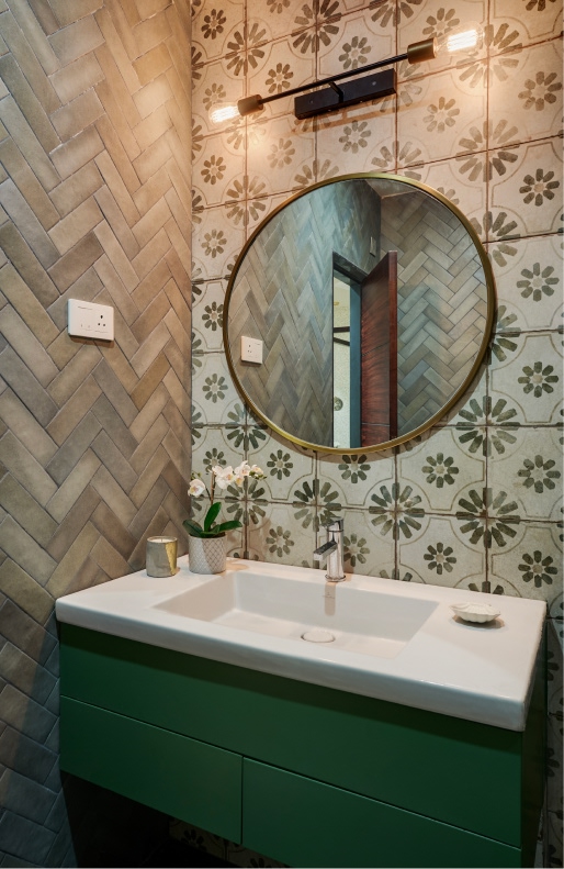 In the resting spaces, colour plays second fiddle to the sovereignty of neutrals, the former featuring as mindful accents. A velvet bed set against a striped wallpaper is complemented by a burgundy daybed and a cane-front console, creating a layered master suite.