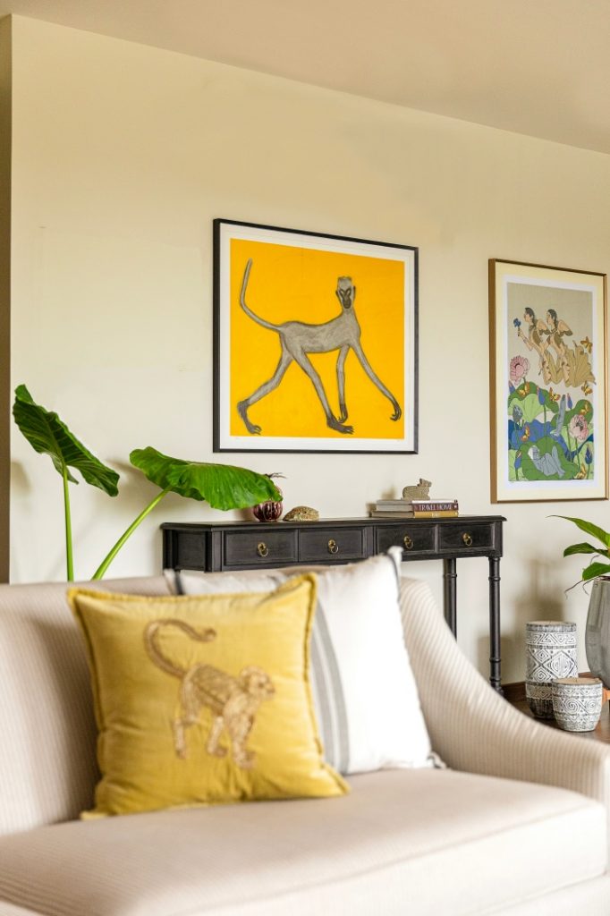 Art plays a pivotal role with an array of eclectic prints adorning the walls, iterating a curated, gallery-esque charm. Whimsical accents punctuate the home — think of unexpected objects and playful details, adding warmth and sparking conversation. The result is a thoughtfully layered space that feels deeply curated, lived-in, and joyfully expressive of the stories of the ones who dwell within.