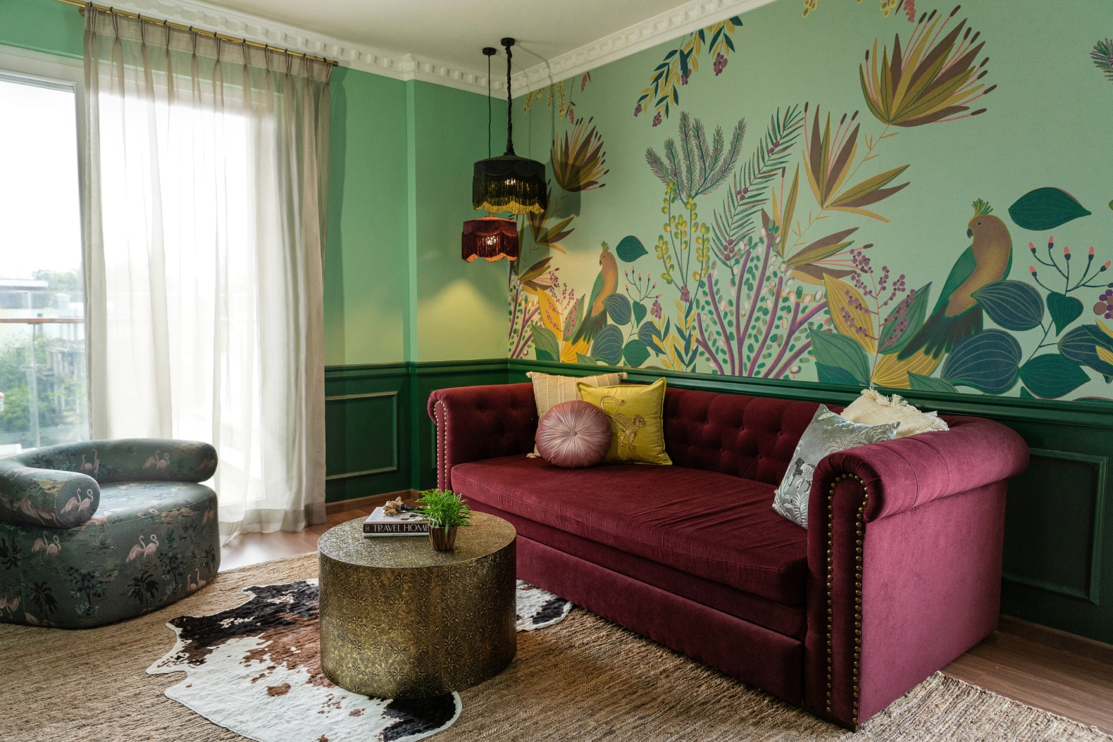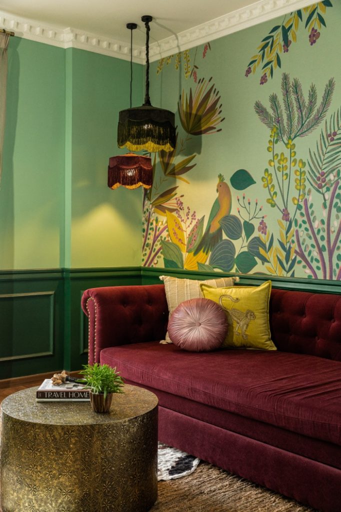 We layered the space with various textures and prints, seamlessly combining stripes, florals, damask, and plush velvet to create a visually rich yet cohesive milieu.