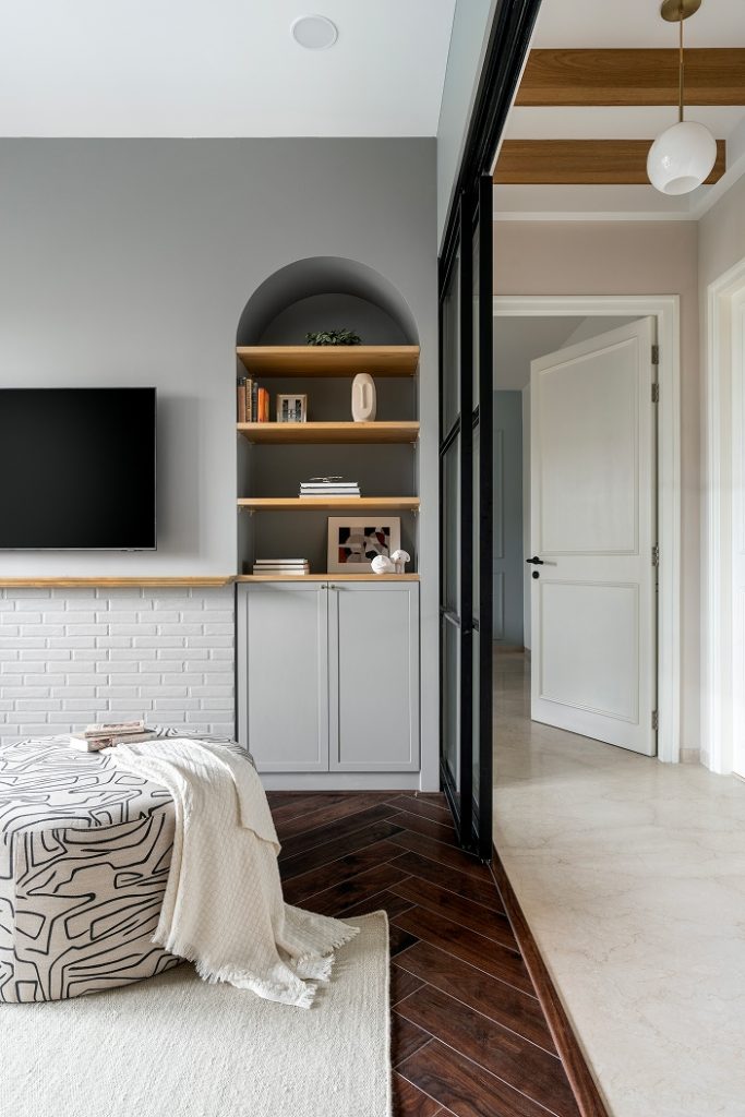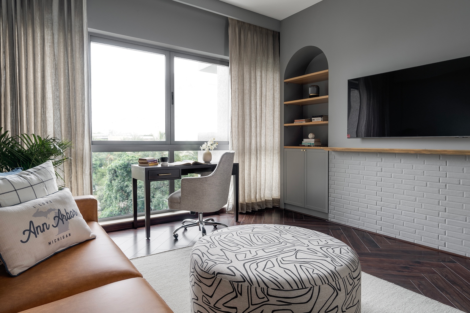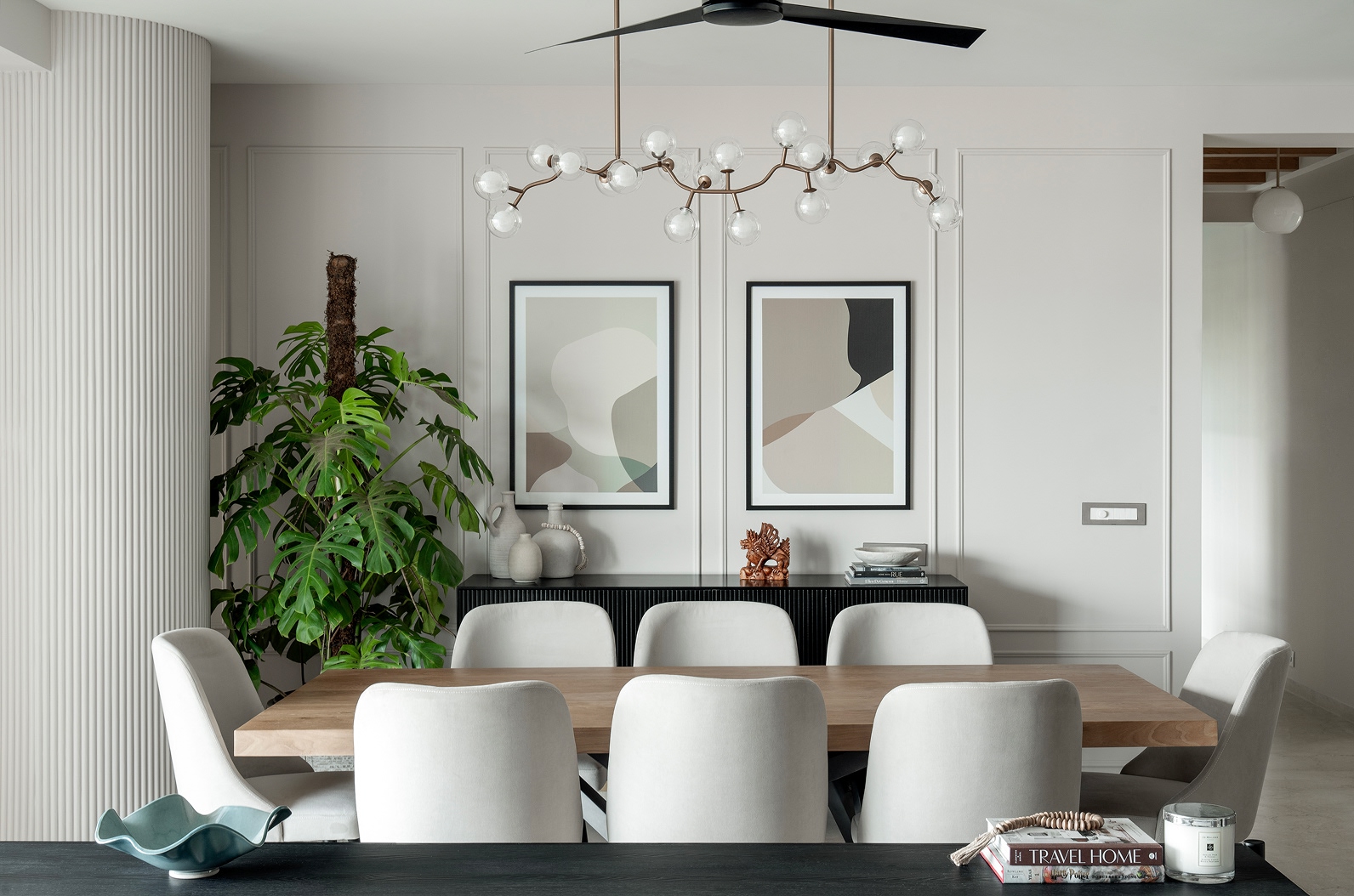 An open living cum dining space forms the home’s nucleus, its palette of hues and materiality striking a mindful balance between stated colours and subtle pattern play. The hearty kitchen becomes the family’s epicentre when they dine and host, its deep indigo island commanding attention at its centre.