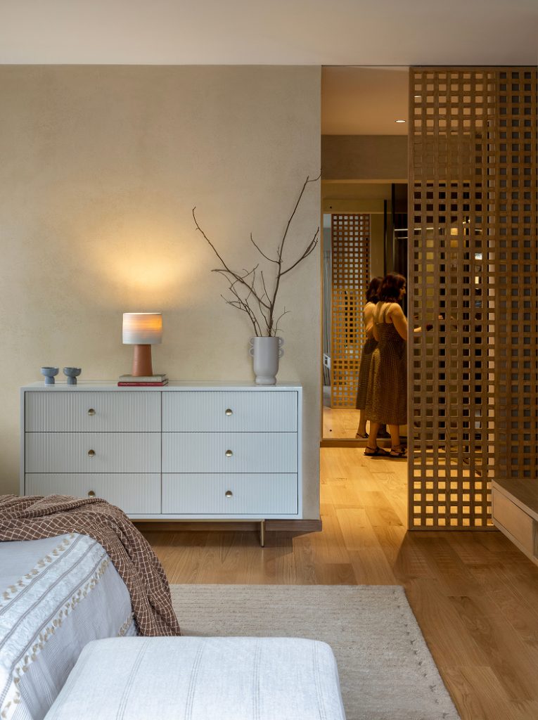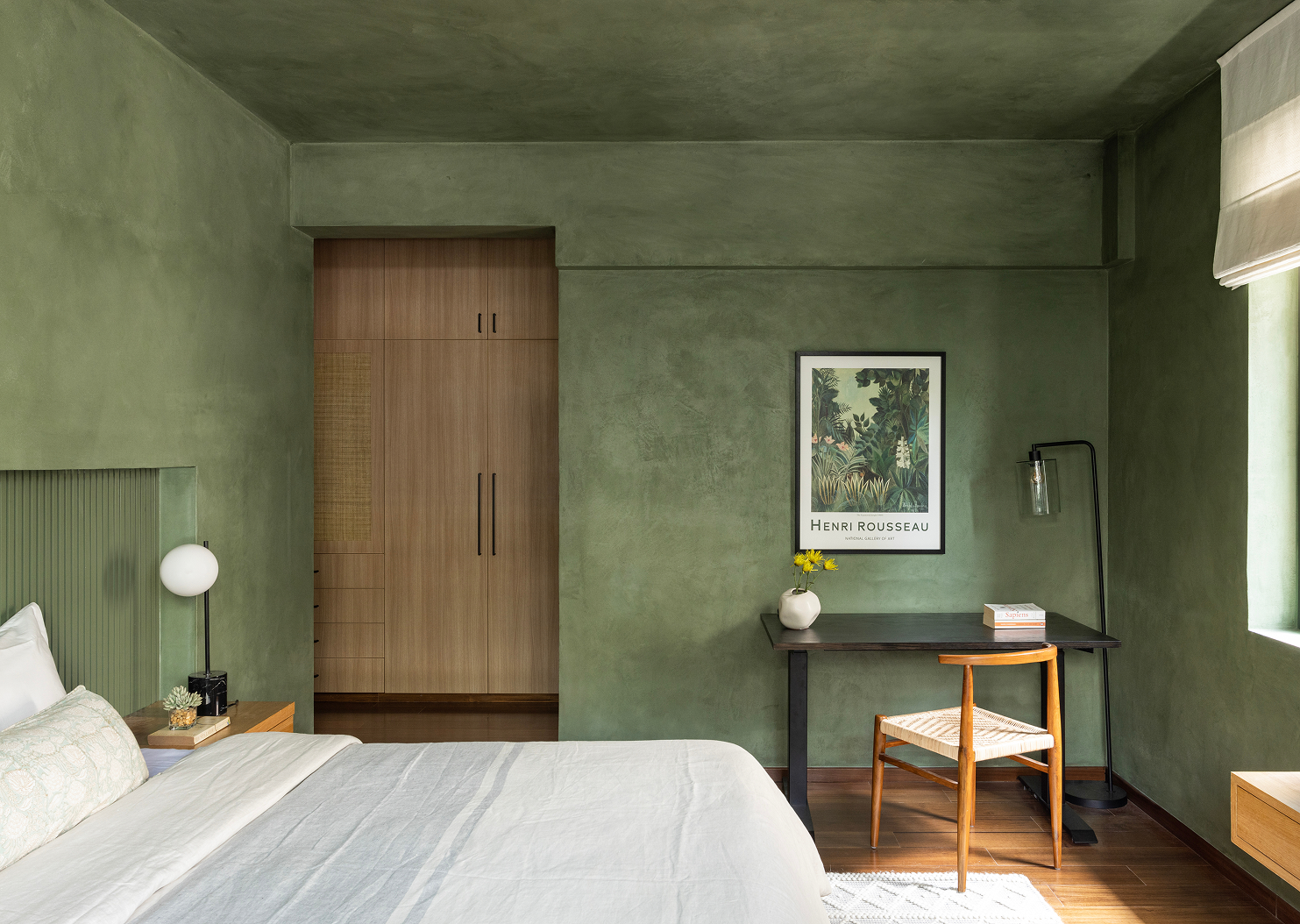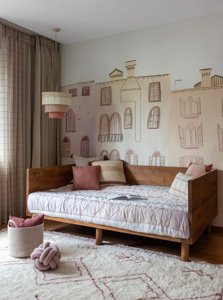 Daylight suffuses the master suite, its curation akin to a holiday retreat with earthy tones inside mirroring the dense greenery outside. The child’s bedroom is a modern take on Bohemian influences, with hues of rust and salmon engaged in playful dialogue. The guest bedroom is an immersive space steeped in mottled green’s ubiquitous embrace, cocooning you upon arrival.