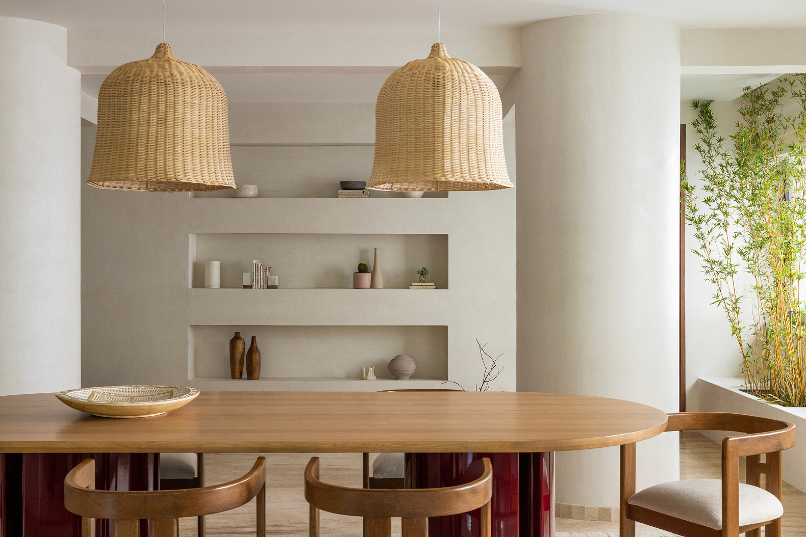 Anchoring a sculptural identity steeped in stillness, Tulum House morphs the lens through which we’re used to encountering minimalism. The space evokes a Tulum meets SoCal design language, articulated through the masterful strokes of wood, chalky lime plaster, cool marble floors, and bursts of colour in cameos.